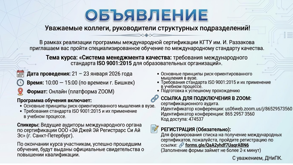 Тема курса: «Система менеджмента качества: требования международного стандарта ISO 9001:2015 для образовательных организаций».