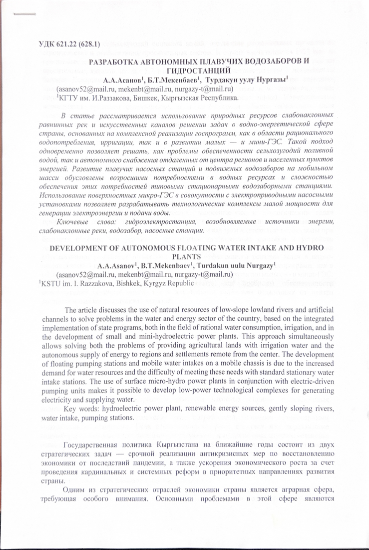 1 | Турдакун уулу Н. Асанов А.А. Мекенбаев Б. | Разработка автономных плавучих водозаборов и гидростанций | Статья |