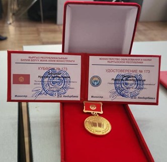 Оморова Нургуль Амадалиевна — награждена медалью «Отличник образования».