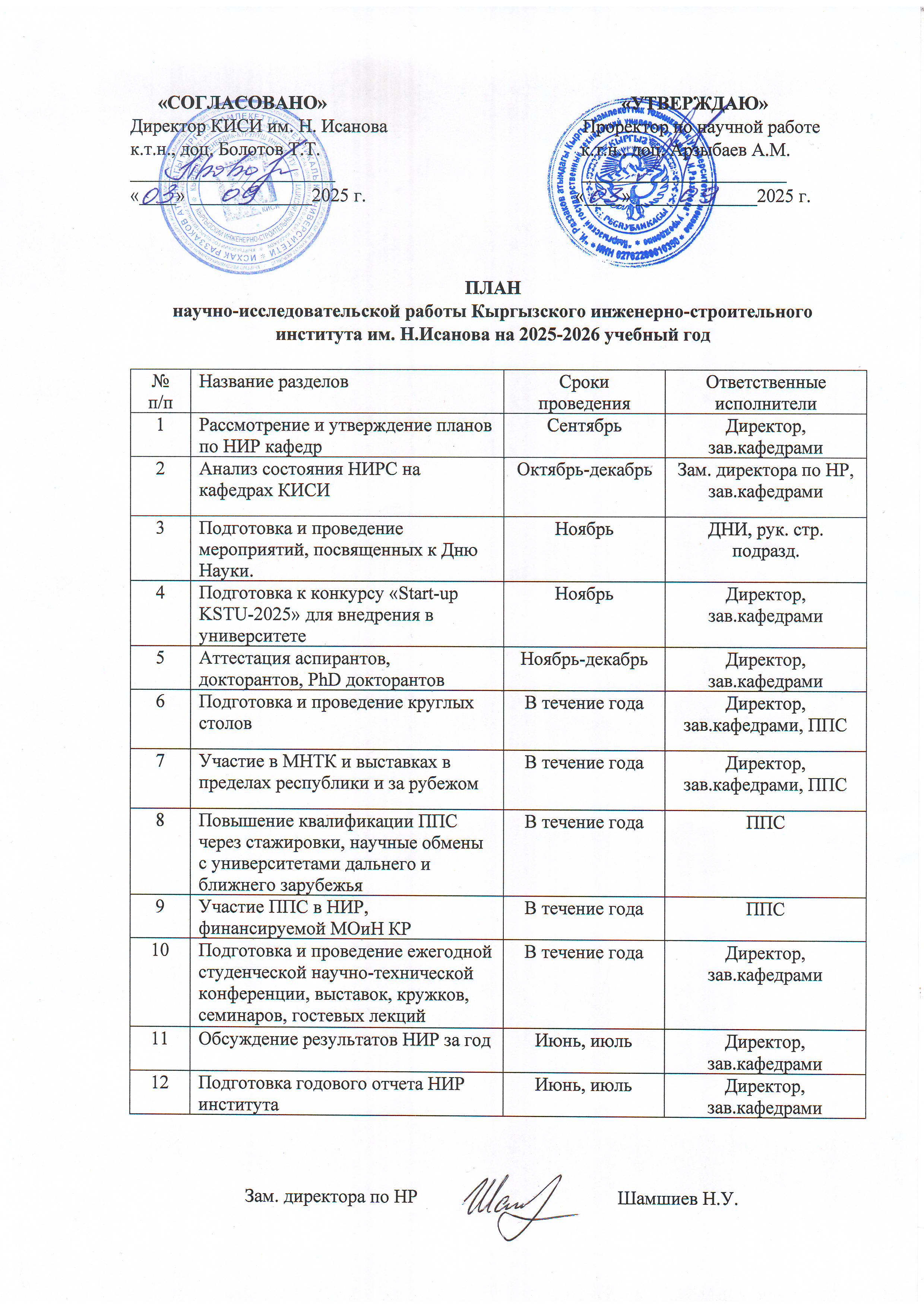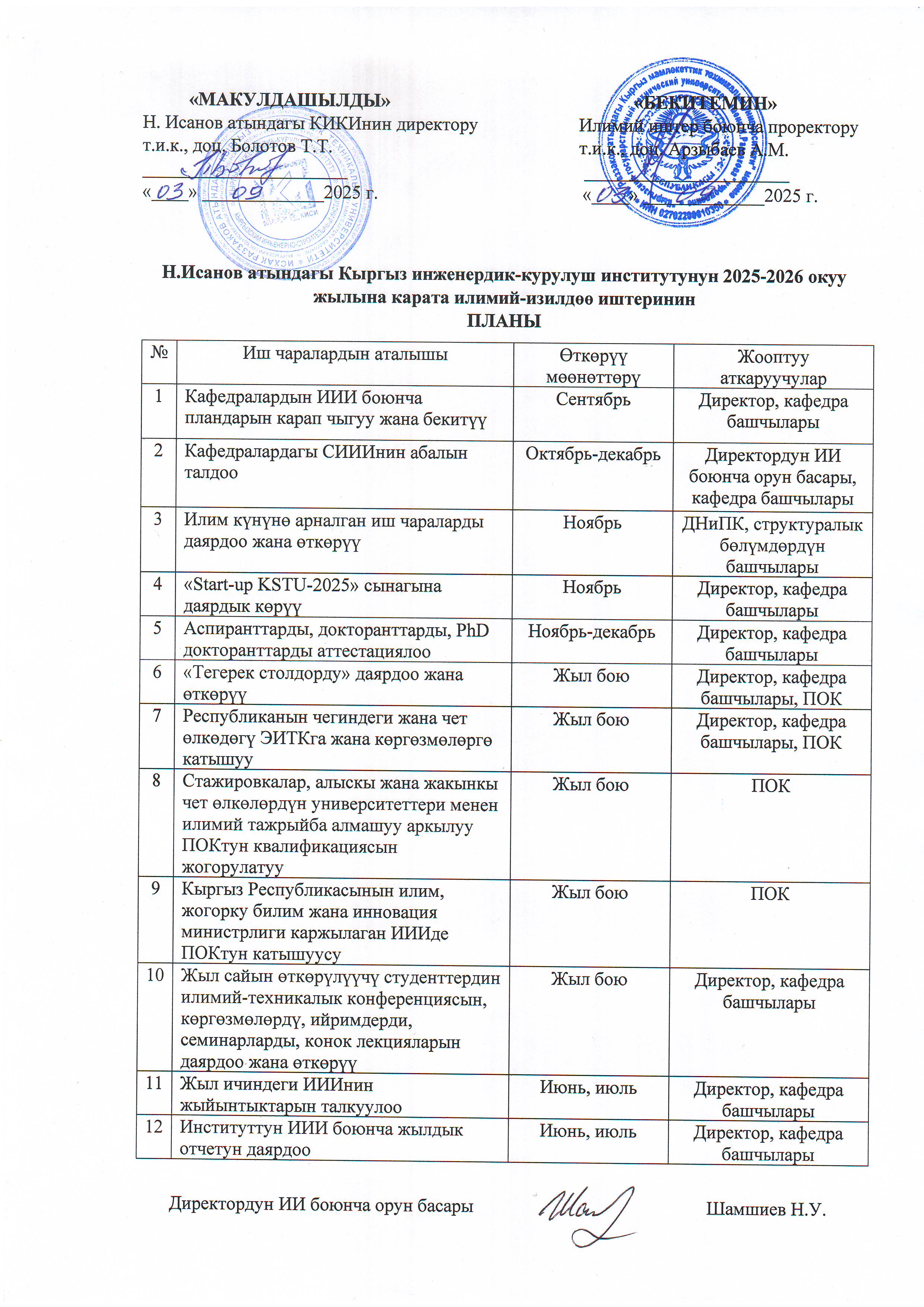 Н. Исанов атындагы Кыргыз инжинердик-курулуш институтунун 2025-2026 окуу жылына карата илимий-издилөө иштеринин планы / План научно-исследовательской работы КИСИ 2025 - 2026 уч. год.
