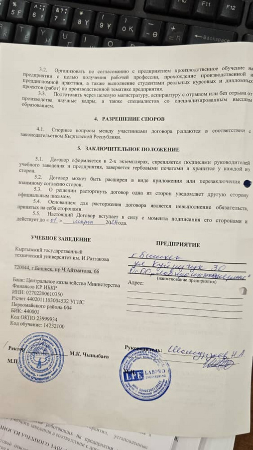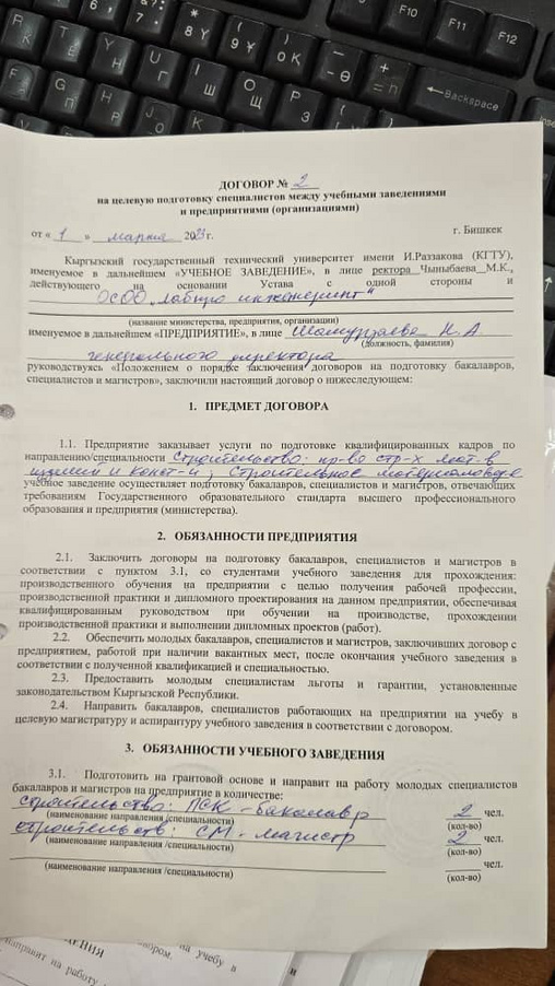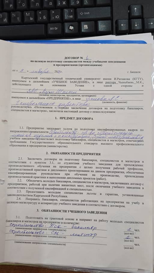 Кафедранын Студенттердин практика отусундо жана келечекте жумуш ордулары менен камсыз болуу максатында адистик боюнча ишканалар жана ондуруштор менен келишимдер тузулгон
