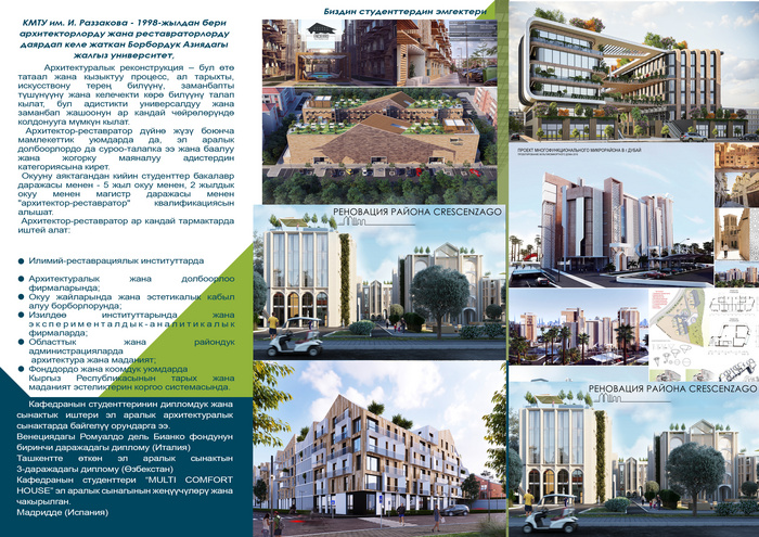 Die Abteilung für Restaurierung und Rekonstruktion des architektonischen Erbes ist die einzige Abteilung in Zentralasien, die seit 1998 Architekten-Restauratoren ausbildet.