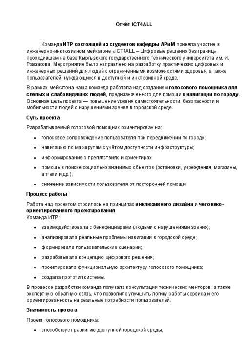В рамках мейкатона наша команда работала над созданием голосового помощника для слепых и слабовидящих людей, предназначенного для помощи в навигации по городу. Основная цель проекта — повышение уровня самостоятельности, безопасности и мобильности людей с нарушениями зрения в городской среде.