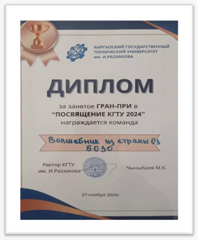 Айтбаева Акылай, студент группы БТ(б)-1-21,  по результатам 2024-2025 учебного года удостоена  президентской стипендии за особые достижения в учебной, научно-творческой и общественной деятельности. Также,  Айтбаева Акылай заняла 1-е место в стартап-конкурсе КГТУ и была награждена денежной премией в размере 30000 сомов.