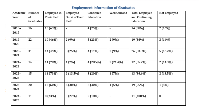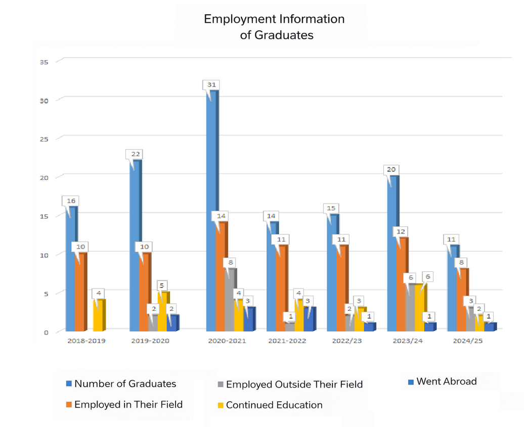 Within the framework of the department's educational programs, systematic work is carried out to monitor the employment of graduates, as well as their career growth. One of the main criteria for assessing the level of graduates' training is their demand by enterprises. Job placement monitoring shows high results, ranging from 85-100%. %. Our graduates successfully work at many leading food industry enterprises, which indicates a high level of specialist training. At the institute and university levels, annual events are held with representatives of industries, job fairs, round tables, seminars where vacancies in industries are also announced. The stable career growth of our graduates confirms the high level of quality of the educational program on the one hand, the competitiveness of graduates in the labor market and, consequently, the guarantee of their employment, on the other hand. Statistical information on the employment status of graduates of the educational programs of the Department of "Machines and apparatuses of food production" is presented below