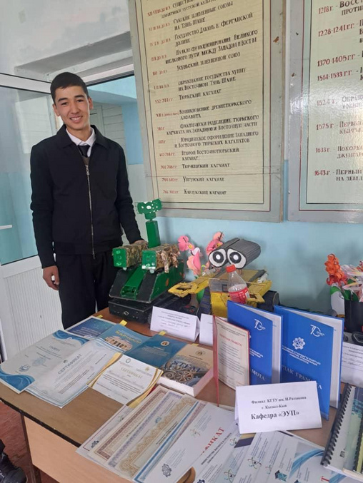 Студент группы Э-24 Каримов Нурилим представил на обозрение участников свой собственный изобретённый макет. Работа подготовлена под руководством преподавателя Жунусалиева Галмамата.