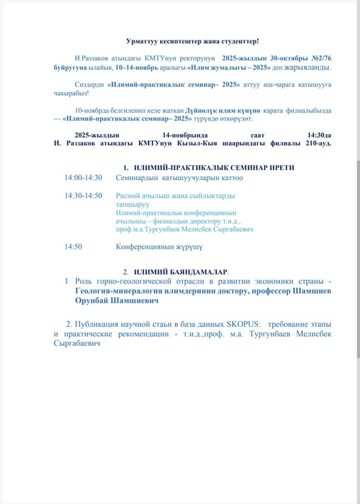 В соответствии с приказом ректора Кыргызского государственного технического университета имени И. Раззакова №2/76 от 30 октября 2025 года, период с 10 по 14 ноября был объявлен «Научной неделей – 2025». В её рамках 14 ноября 2025 года в Кызыл-Кийском филиале КМТУ успешно был проведён «Научно-практический семинар – 2025».