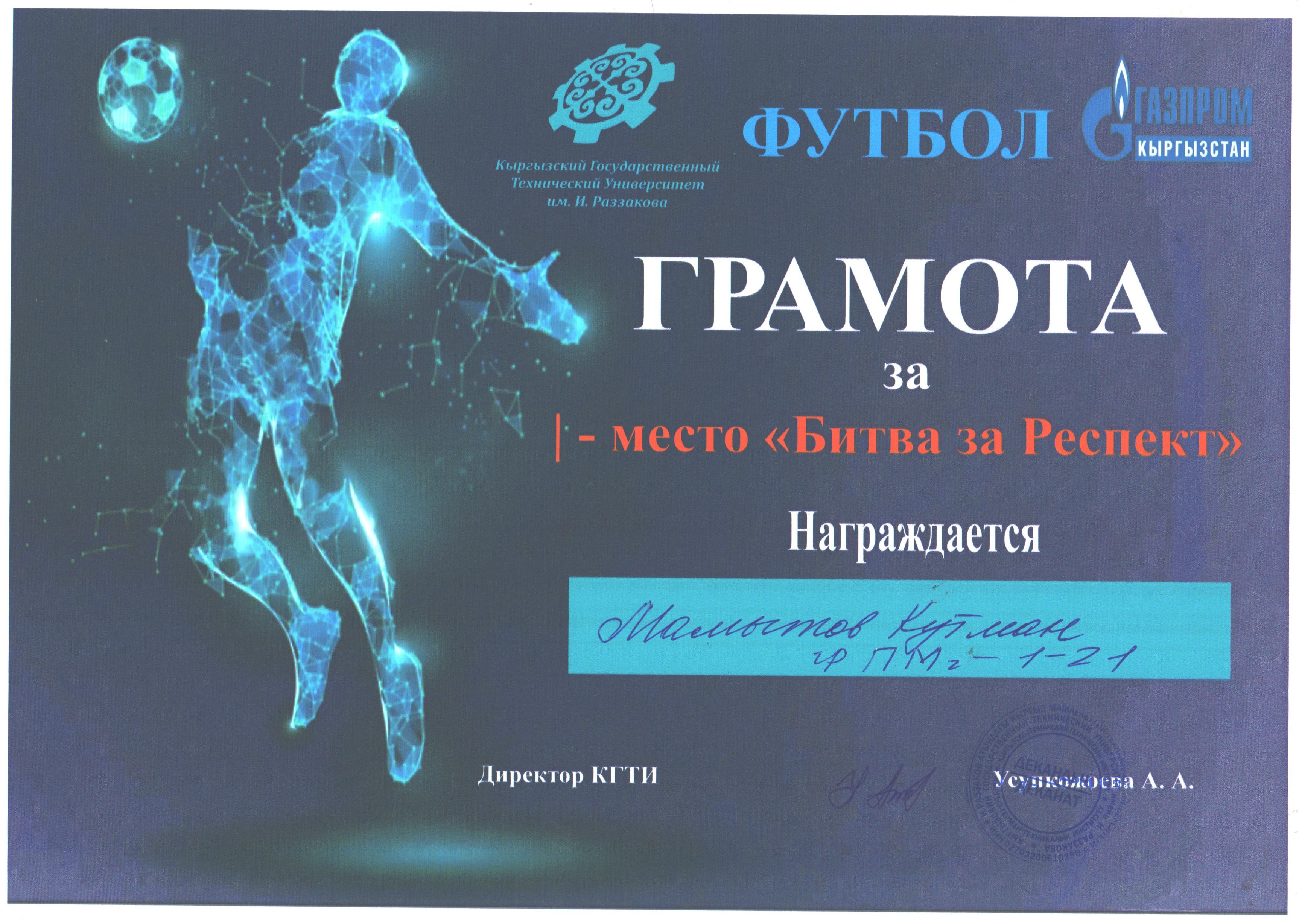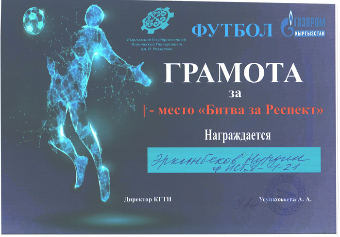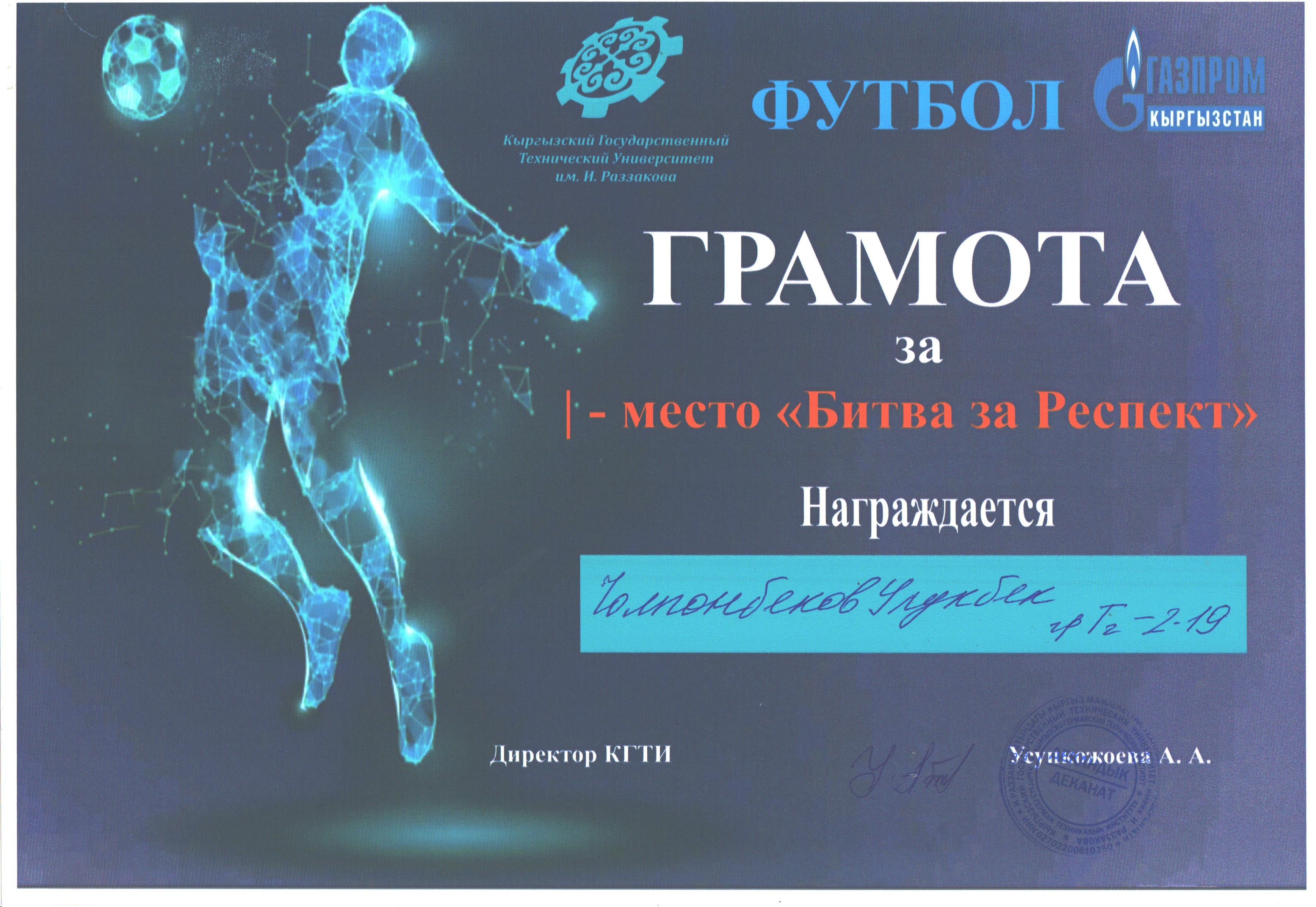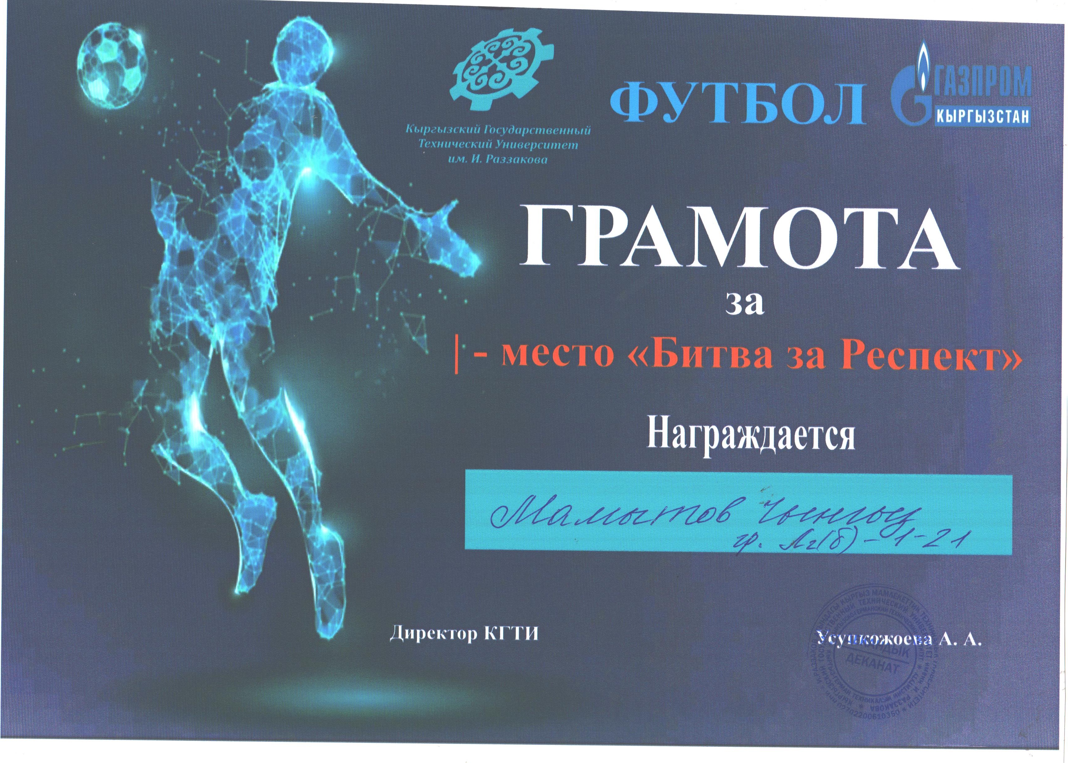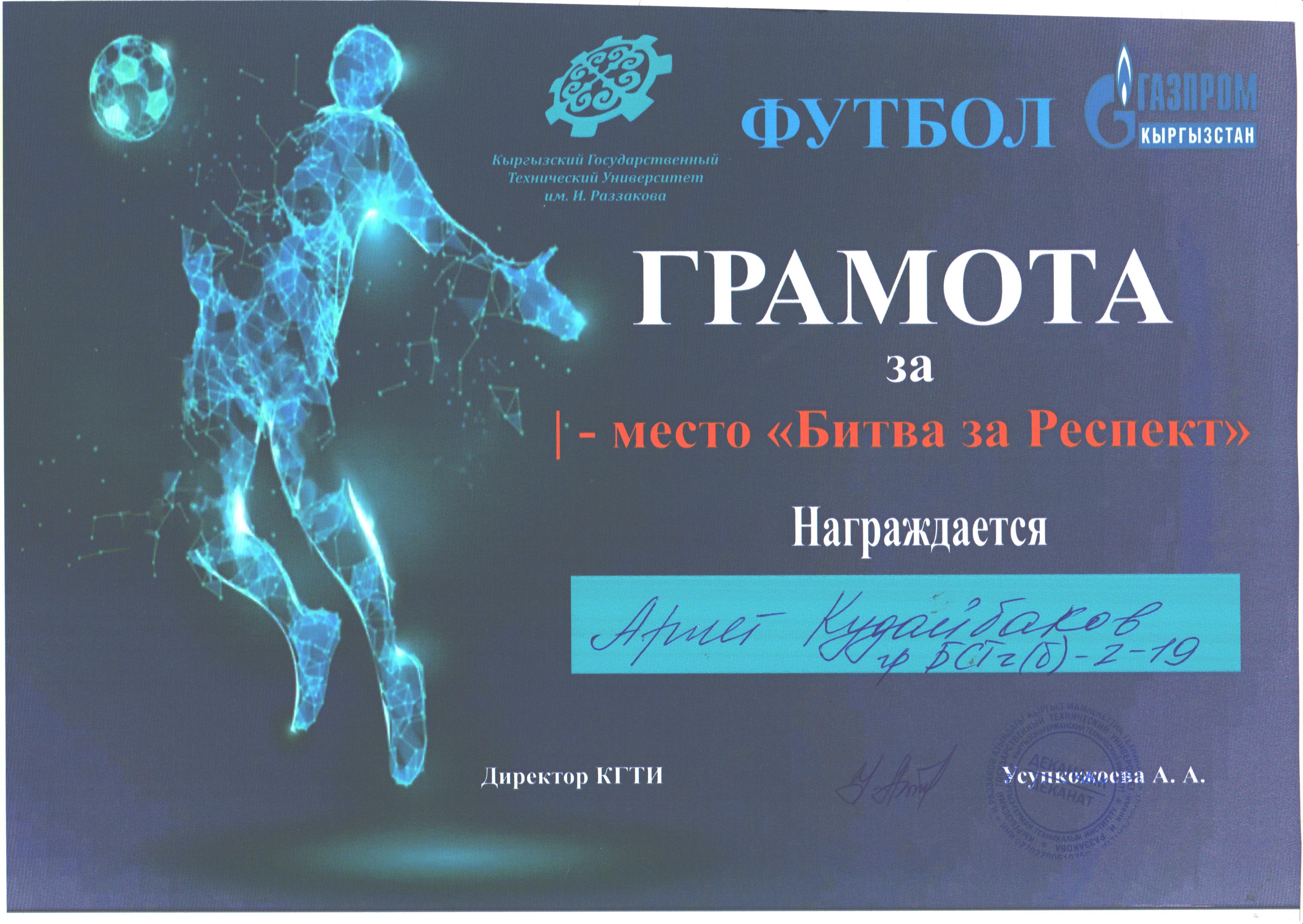 3 марта 2021 года в спортивном зале КГТУ им. И. Раззакова прошло военизированное состязание под названием «Битва за респект», приуроченное ко Дню защитника Отечества. В ставшем уже традиционном мероприятии приняли участие 8 сборных команд всех факультетов и институтов университета. Почётные гости отметили высокую степень ответственности конкурсантов и особо выделили организаторскую роль директора Департамента по социальной и воспитательной работе Абдусаматовой Ж.К., которая совместно с Комитетом по делам молодежи приложила максимум усилий для того, чтобы конкурс прошел на должном уровне и привлек внимание студентов и преподавателей, заполнивших зал до отказа.