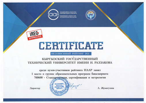 По итогам независимого национального рейтинга НААР (Независимое агентство аккредитации и рейтинга — IAAR) за 2021 год Кыргызский государственный технический университет имени И. Раззакова занял 1-е место среди вузов-участников по образовательной программе 7000600 — Стандартизация, сертификация и метрология.