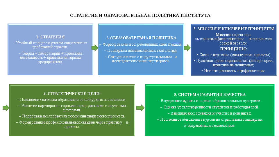 Учебный процесс Кыргызского горно-металлургического института им. академика У.Асаналиева сочетает теорию, лабораторные работы, научно-проектную деятельность и практику на полигонах и предприятиях-партнёрах. Образовательная политика направлена на формирование востребованных компетенций, поддержку инноваций и сотрудничество с горной отраслью.