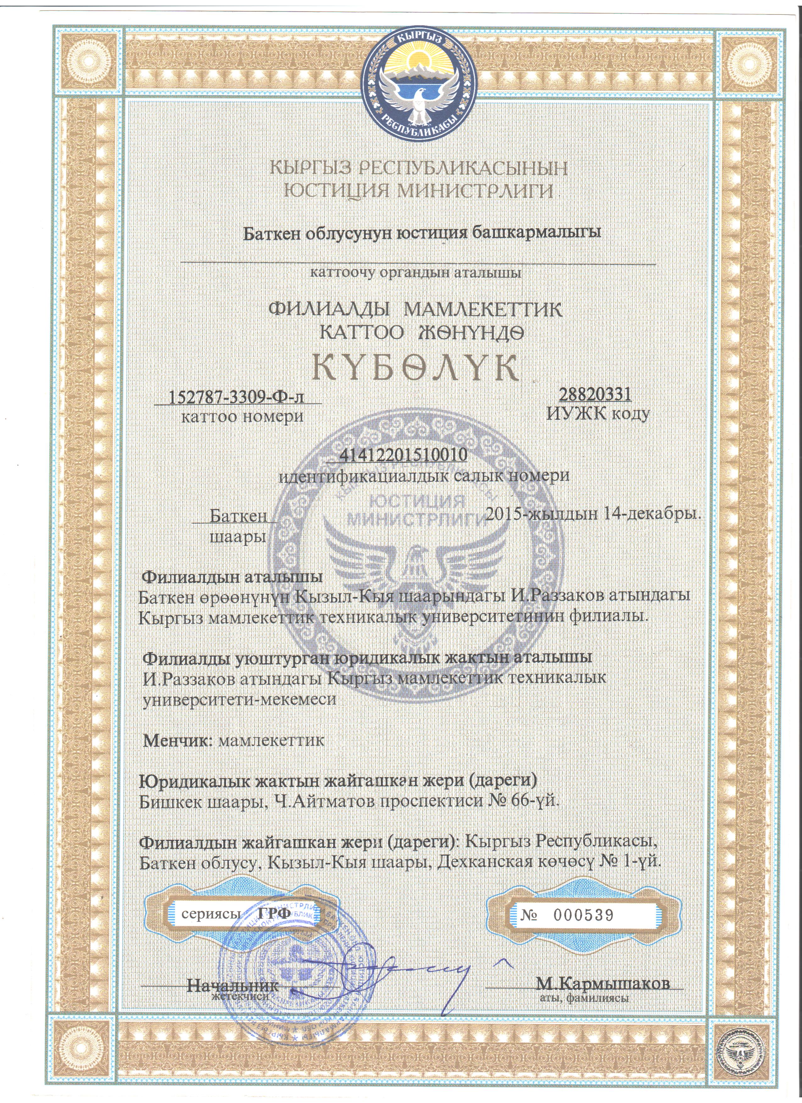 Свидетельство о государственной регистрации филиала
