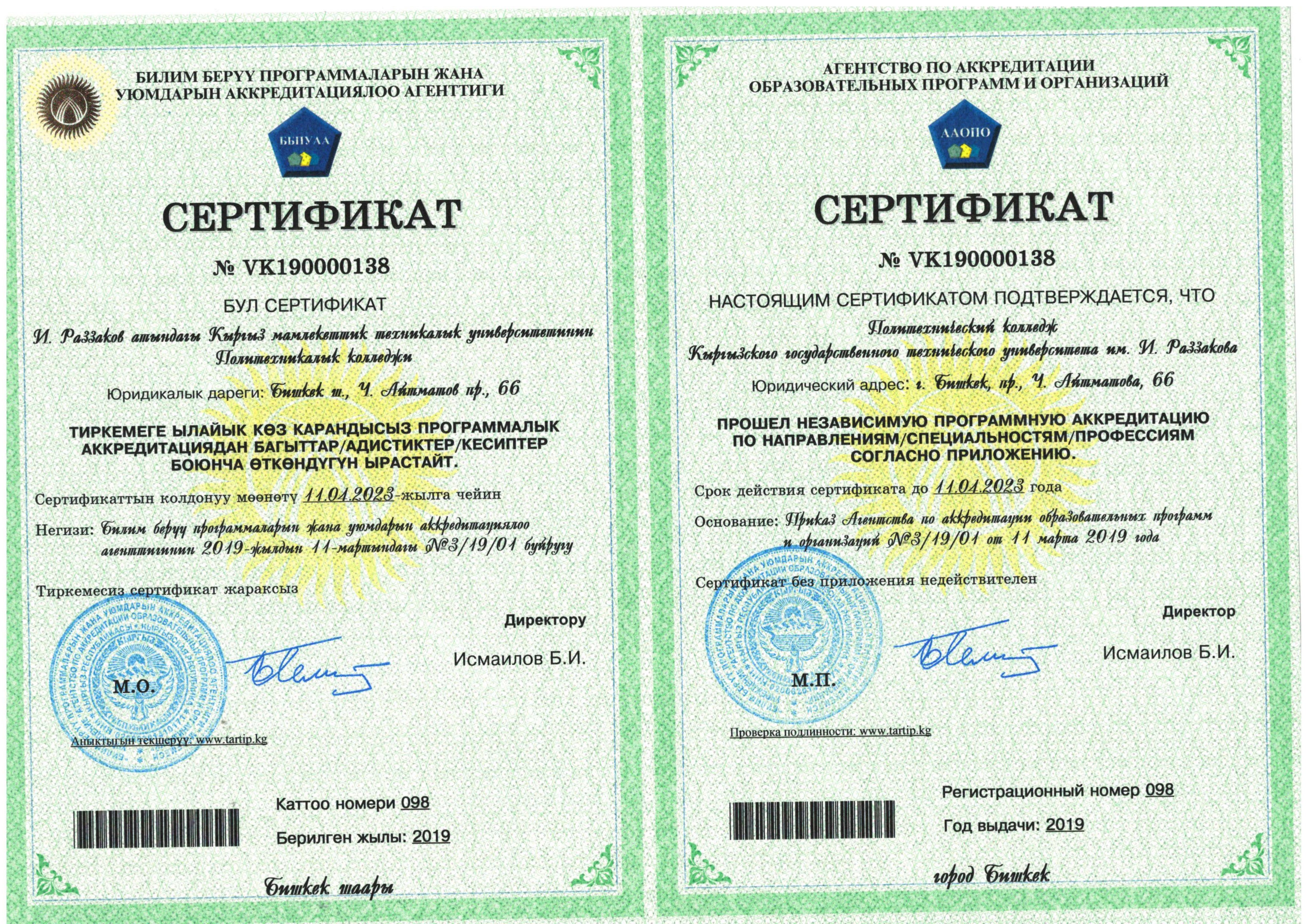 Жакында сиз биздин колледждин боордош студенттерибиздин бири болуп, сыймыктануу менен: “Мен – И.Раззаков атындагы КМТУнун Политехникалык колледжинин студенттимин! – деп айтарыңызга биз ишенебиз.