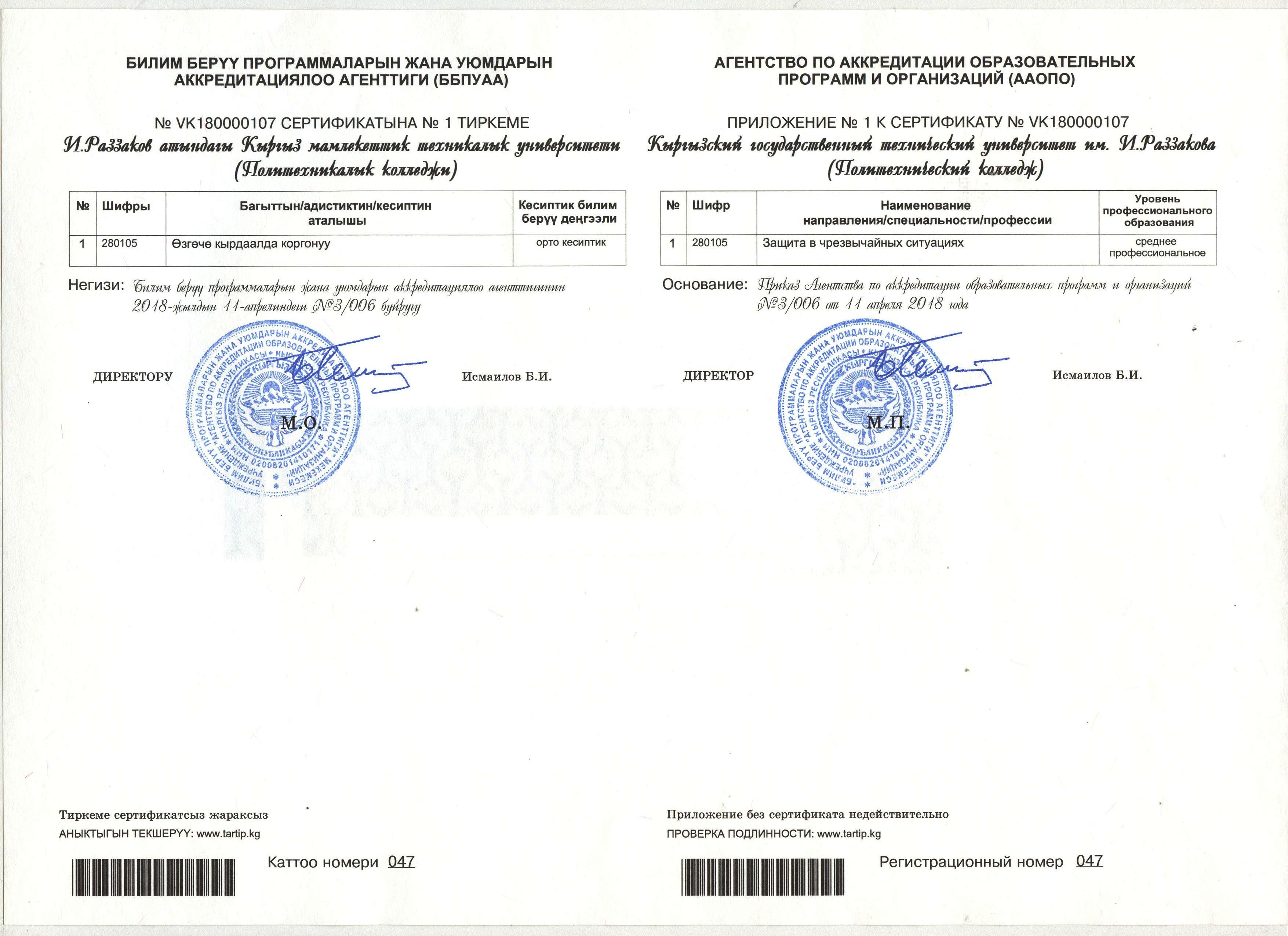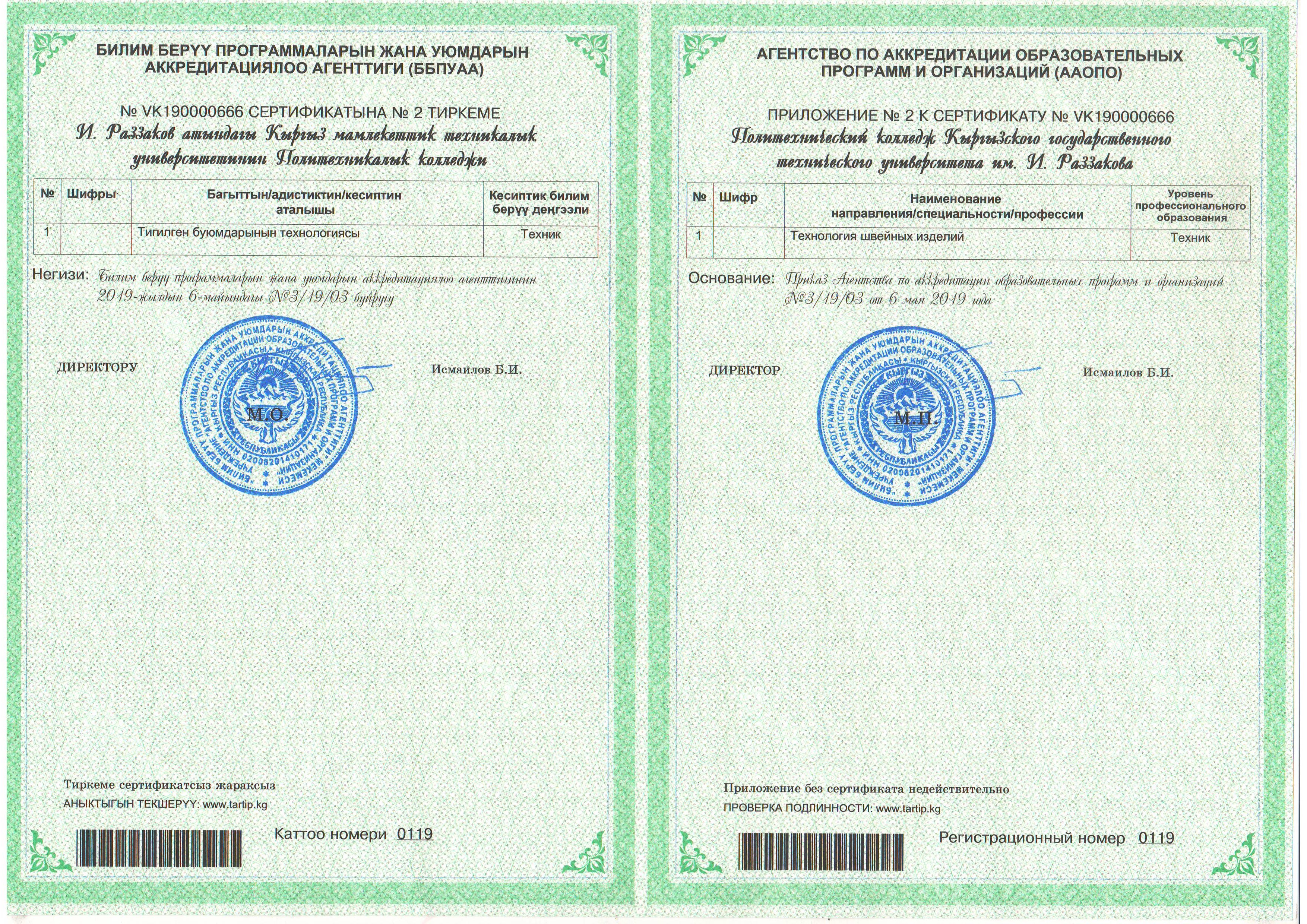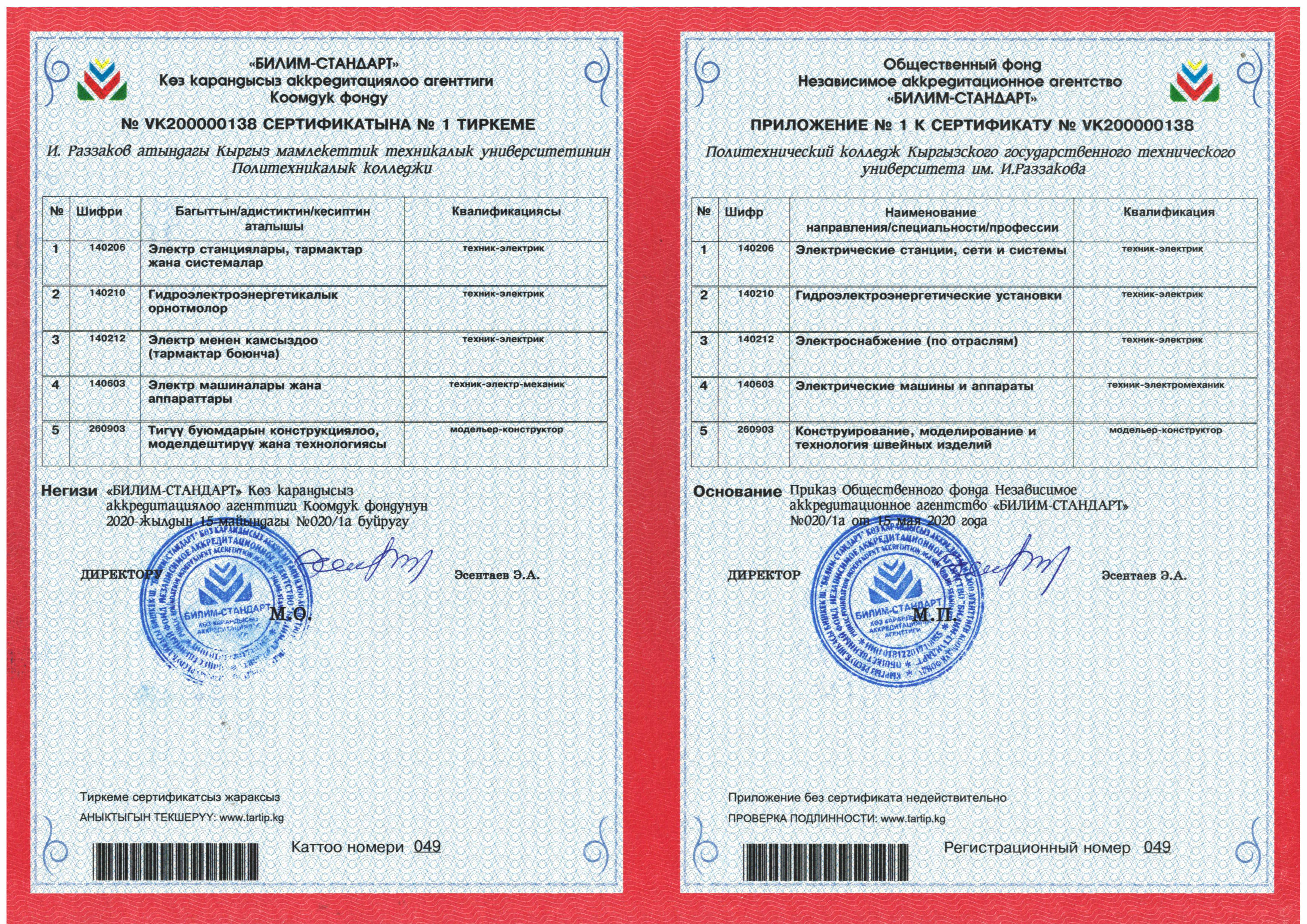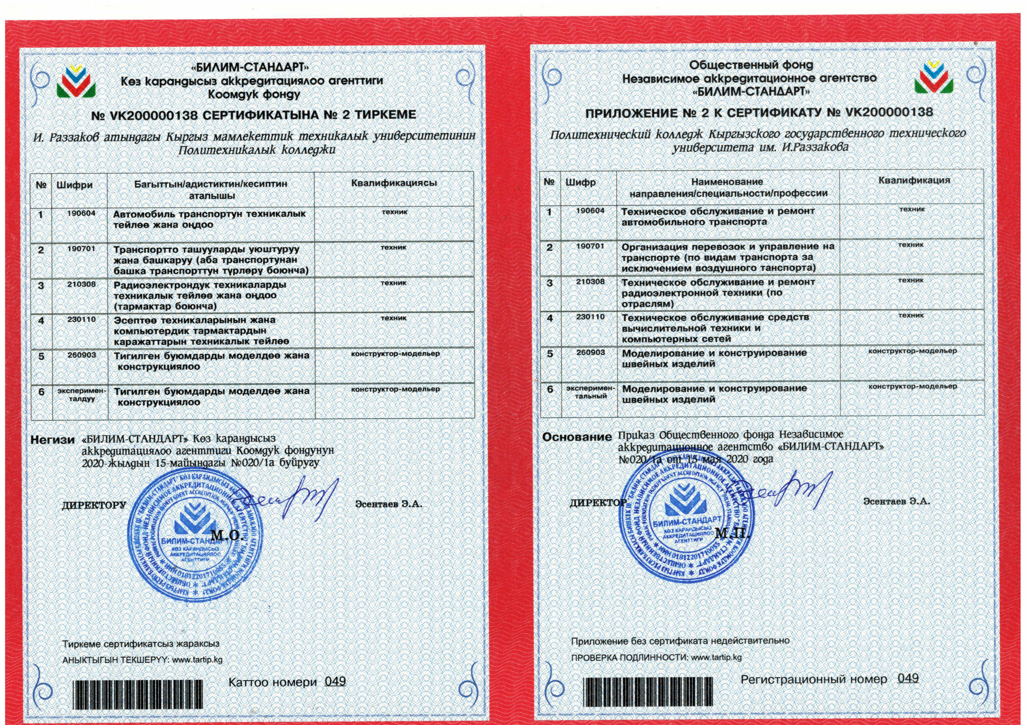 И.Раззаков атындагы КМТУнун Политехникалык колледжи – күндүзгү окутуу формасындагы 7 адистик боюнча ортоңку звенодогу квалификациялуу адистерди даярдоо үчүн бардык зарыл шарттары бар динамикалуу өнүгүп келе жаткан билим берүү мекемеси: