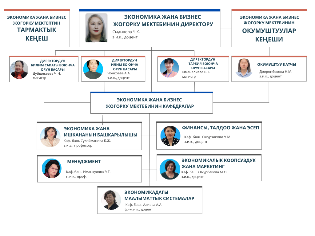 Экономика жана бизнес Жогорку мектебинин кафедралары 7 багыт боюнча бакалаврларды, 1 багыт боюнча адистерди, 5 багыт боюнча магистрлерди жана 3 багыт боюнча PhD докторанттарды даярдайт.