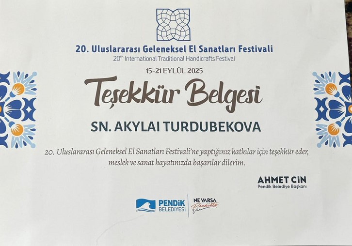 12-26 сентябрь 2015 жылдары ХПК-2-23 тобунун студенттери Турдубекова Акылай жана Чекирбаева Элиза Стамбулда өткөн 20-эл аралык салттуу кол өнөрчүлүк фестивалына катышышты. Өлкөлөр салттуу искусствосун көрсөтуу кызыктуу атмосферада болду-көргөзмө, лекциялар жана жаңы таанышуулар. Фестивалдын максаты-тажрыйба алмашуу, салттуу кол өнөрчүлүктү өздөштүрүү жана элдердин достугун чыңдоо. Жыйынтыктоочу күнү маданиятыбыздын эң кооз салттарынын бири болгон белек берүү аземин өткөрдүк.