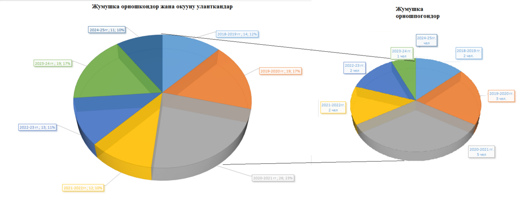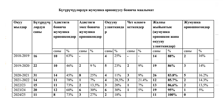 Кафедранын билим берүү программаларынын алкагында бүтүрүүчүлөрдүн ишке орношуусуна, ошондой эле алардын карьералык өсүшүнө мониторинг жүргүзүү боюнча системалуу иштер жүргүзүлүүдө. Бүтүрүүчүлөрдүн окутуу деъгээлин баалоо үчүн негизги критерийлердин бири ишканалардын, алардын суроо-талап болуп саналат. Ишке орноштуруу мониторинги жогорку натыйжаларды көрсөтүүдө – 85-100% чегинде. %. Биздин бүтүрүүчүлөр тамак-аш өнөр жайынын көптөгөн алдыңкы ишканаларында ийгиликтүү иштеп жатышат, бул адистердин жогорку деңгээлде даярдыгынан кабар берет. Институттун жана университеттин деңгээлинде жыл сайын өндүрүштөрдүн өкүлдөрү менен иш-чаралар, бош орундардын жарманкеси, тегерек столдор, семинарлар өткөрүлүп турат. Биздин бүтүрүүчүлөрдүн туруктуу карьералык өсүшү бир жагынан билим берүү программасынын сапатынын жогорку деңгээлин, бүтүрүүчүлөрдүн эмгек рыногундагы атаандаштыкка жөндөмдүүлүгүн жана экинчи жагынан алардын ишке орношуусунун күрөөсүн тастыктайт. Төмөндө "тамак-аш өндүрүшүнүн машиналары жана аппараттары"кафедрасынын билим берүү программаларынын бүтүрүүчүлөрүнүн ишке орношуусу боюнча статистикалык маалыматтар келтирилген