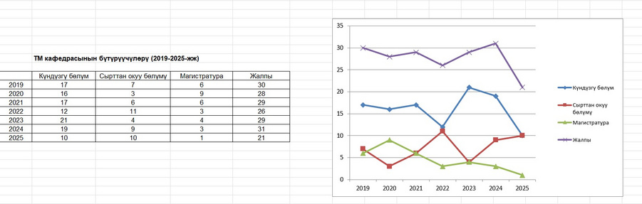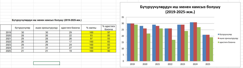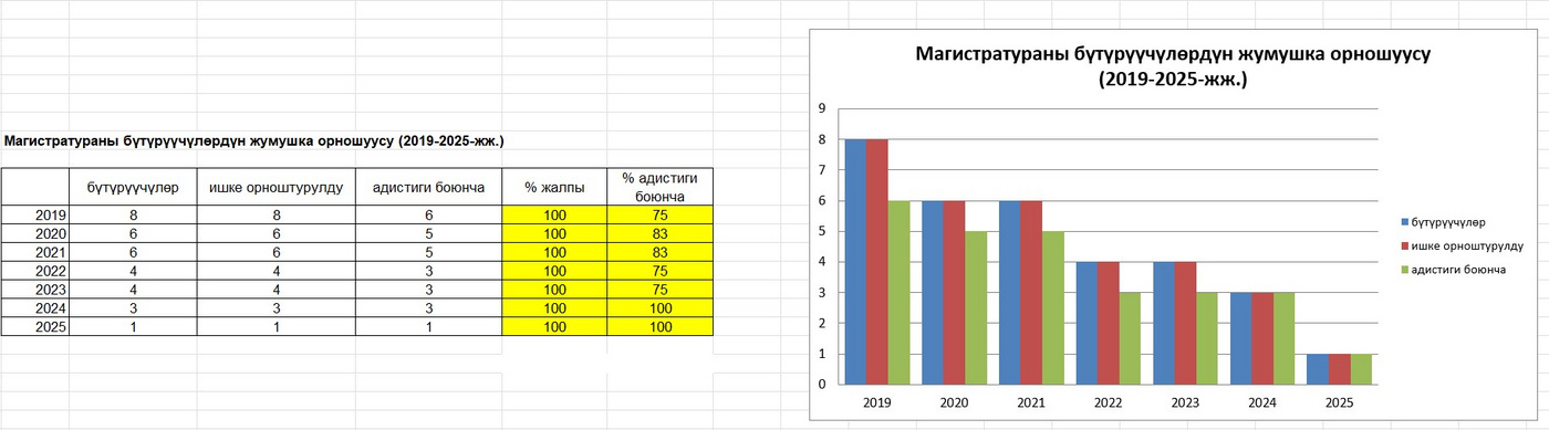 Кафедранын билим берүү программаларынын алкагында бул программалардын бүтүрүүчүлөрүнө ишке орноштуруу боюнча системалуу иштер жүргүзүлүүдө. Факультеттин жана университеттин деңгээлинде уюмдардын өкүлдөрү менен иш-чаралар, Бош орундар жарманкеси өткөрүлөт.