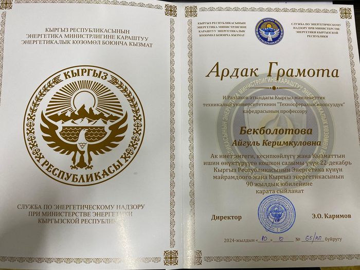 Мурзаканов А.Н - КР УИА Геология институту "Кыргызстандын гидроэнергетикалык системаларынын геоэкологиялык жана Техносфералык коопсуздугу".
