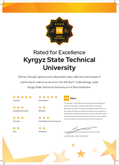 После шести месяцев тщательного анализа деятельности университета, эксперты присвоили КГТУ им. Раззакова статус четырёх звёзд из пяти возможных. QS World University Rankings, являясь самым авторитетным рейтингом университетов в мире, публикуется ежегодно и основывается на методологии, учитывающей множество факторов, таких как академическая репутация, трудоустраиваемость выпускников, результаты исследований и профессионализм преподавательского состава.