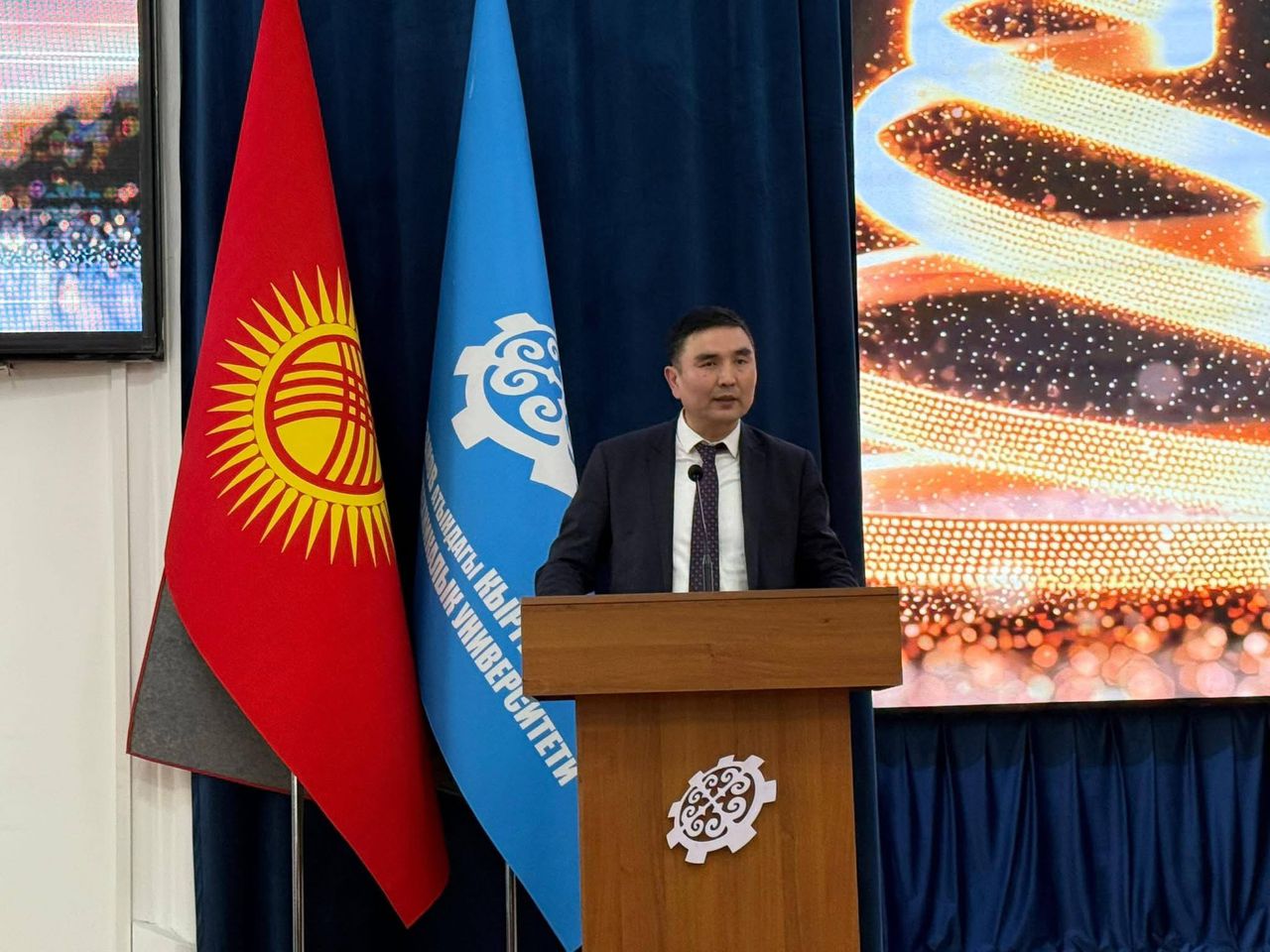 С приветственным словом и новогодними поздравлениями выступил ректор университета Мирлан Койчубекович Чыныбаев. Он поздравил