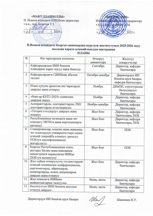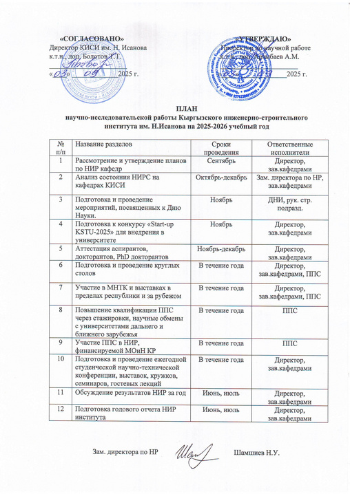 Н. Исанов атындагы Кыргыз инжинердик-курулуш институтунун 2025-2026 окуу жылына карата илимий-издилөө иштеринин планы/ План научно-исследовательской работы КИСИ 2025 - 2026 уч. год.
