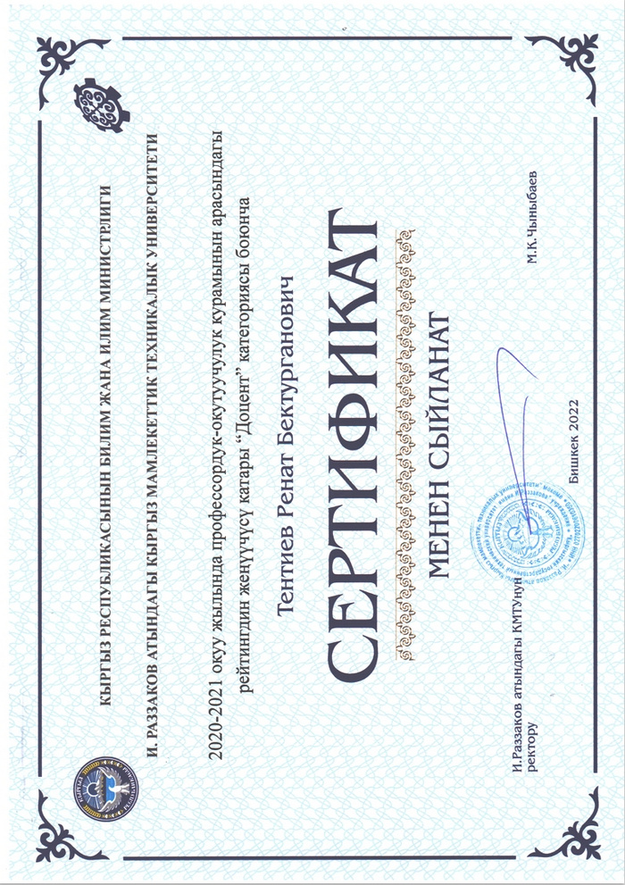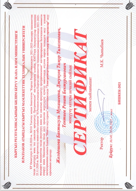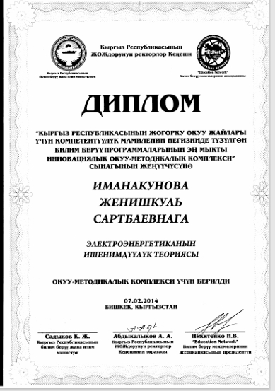 Почетные профессора кафедры «Электроэнергетика»: Водянов А.Р. Генеральный директор ОСОО «Электросила»; Дикамбаев Ш.Б. в.н.с. «НИИЭ» при Министерстве энергетики КР; Исмаилов К.Б. Начальник ПТО ОАО «НЭСК».