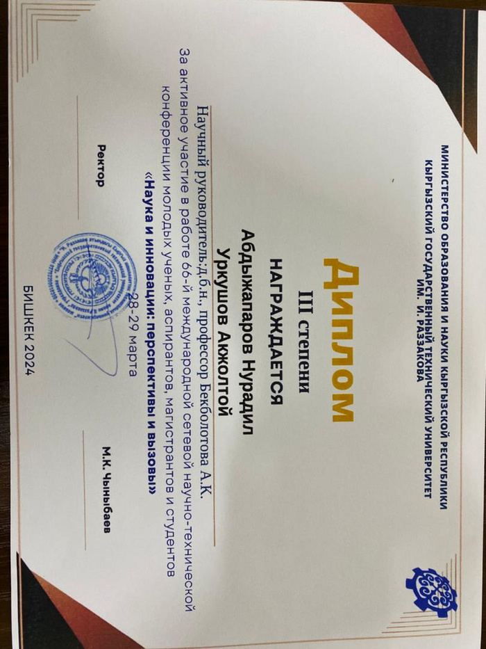 - Умановой Н.Д. "Суусамыр өрөөнүндөгү жайыттардагы “Алтыгана” бадалдарын геоэкологиялык баалоо жана алар менен күрөшүү технологиялары”